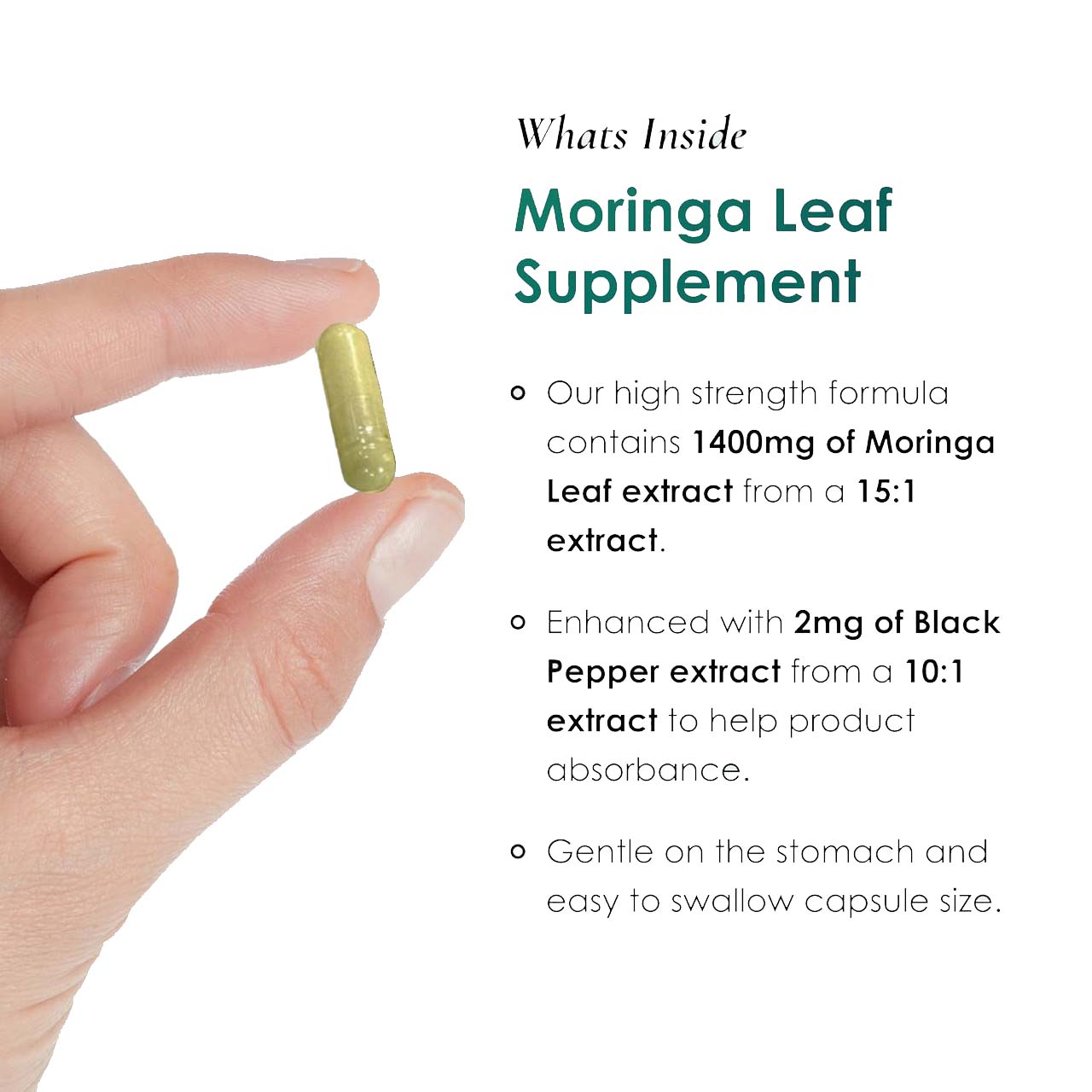 Taking just two capsules a day can make a noticeable difference in your health. It helps the body reduce inflammation naturally, supports gut health and eases digestive discomfort such as bloating. With its unique blend of nutrients, Moringa also works to improve daily energy levels, keeping you active and refreshed throughout the day. Additionally, it strengthens the immune system, helping your body stay protected and resilient.